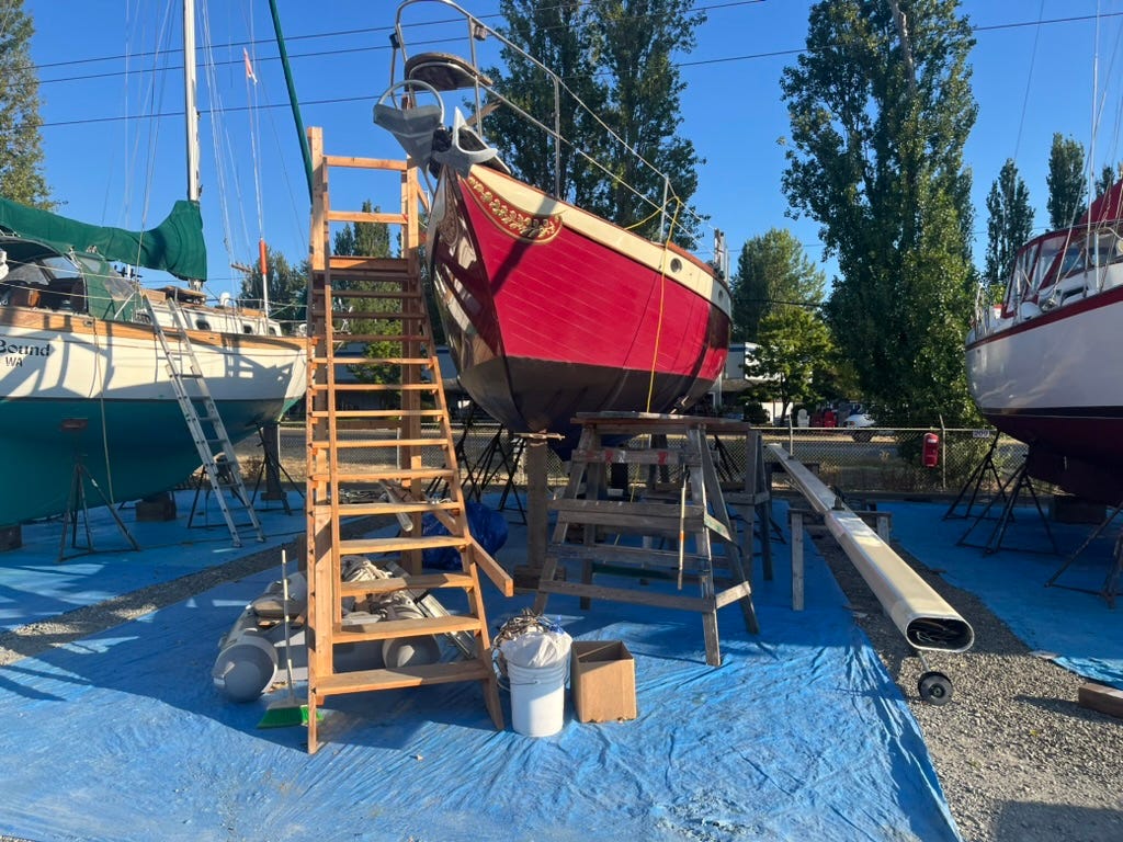 We’re going in without the mast, which is now on saw horses beside Mark's shop. Remember the stairs I built? Well I gave the stairs to Mark in exchange for using a narrow strip of real estate out side his shop for working on the mast. Mark is a shipwright, and has a collection of stairs, and other sundry staging for working on boats. So this is a great deal for me.